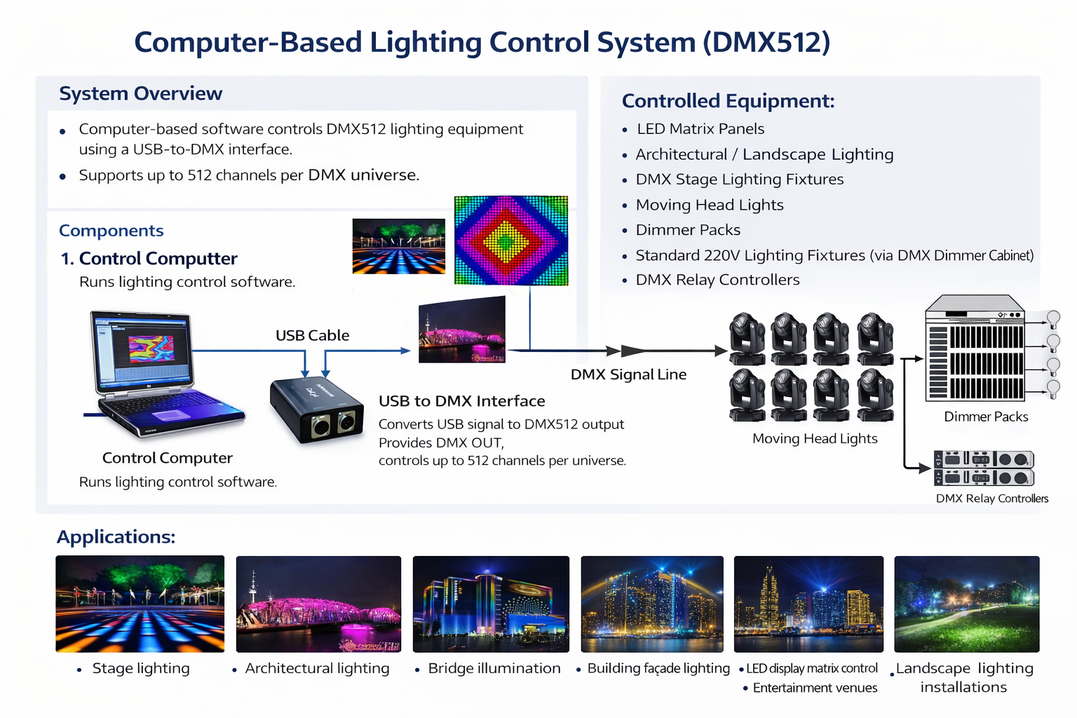 This is a computer software-controlled stage lighting and LED lighting controller. By installing the lighting control software on your computer and using our USB-DMX512 controller, you can control all devices that use standard DMX512 signals, such as moving head lights, scanners, silicon boxes, LED lights, and various industrial equipment controlled by DMX512 signals.